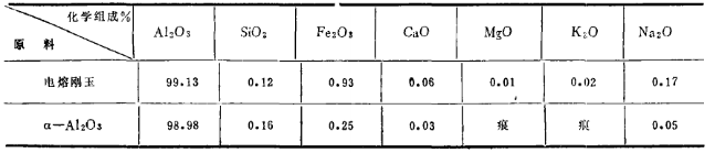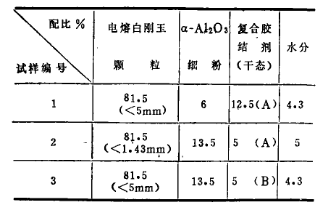 試驗(yàn)所用的顆粒為電熔白剛玉,細(xì)粉部分為α-Al2O3,它們的化學(xué)組成列于表1、電熔白剛玉破碎成<5mm和<1.43mm兩種顆粒、α-Al2O3磨成<0.088mm的細(xì)粉 按表二的配比制作了三種試樣。