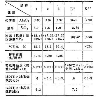 試樣配好經(jīng)混合后,用顆粒澆注法制成25×25×140(mm)的試樣和36×50(mm)的試樣。干燥(110℃×12h)后在1500℃×3h下燒成、對三種試樣的性能進(jìn)行了測定并與英國和蘇聯(lián)的同類產(chǎn)品性能做比較,結(jié)果列于表三。