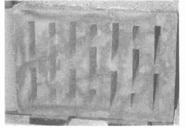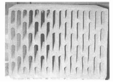 抗壓強(qiáng)度為4. 4N/mm2。該多孔磚的缺點(diǎn)是;其在工業(yè)化的生產(chǎn)中不可避免地會(huì)出現(xiàn)扭曲變形,因此,擠出型的微孔多孔磚必須具有足夠厚度的外壁和齒狀的凸起,便于磚相互間組裝拼接(見圖6),從而消除砂漿連接引起的熱力學(xué)問題。在隨后的試驗(yàn)中還擠出成型了19排孔和13排孔的10DF微孔多孔磚見圖6圖7 ,這些磚外壁還有齒狀的凸起。